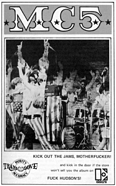 The controversy escalated into an outright war between the band and Hudson’s department stores, as Hudson’s refused to carry the album even after a censored version was available. MC5’s response? They took out a full-page ad in the local underground magazine Fifth Estate that mainly featured a picture of Rob Tyner, with the text “KICK OUT THE JAMS, MOTHERFUCKER! And kick in the door if the store won’t sell you the album on Elektra! FUCK HUDSON’S!”